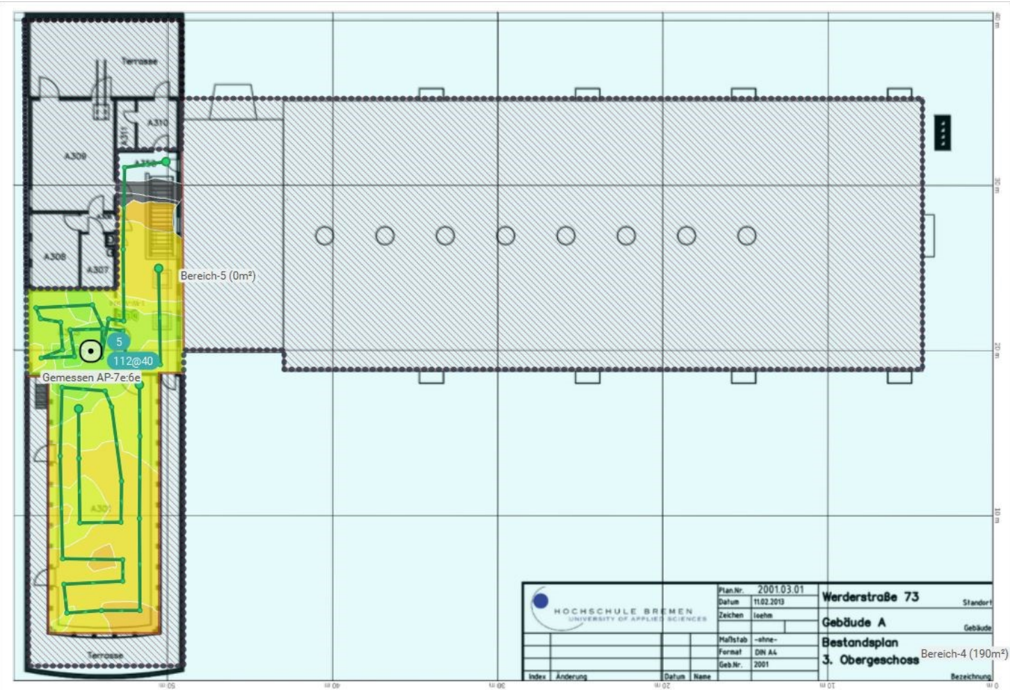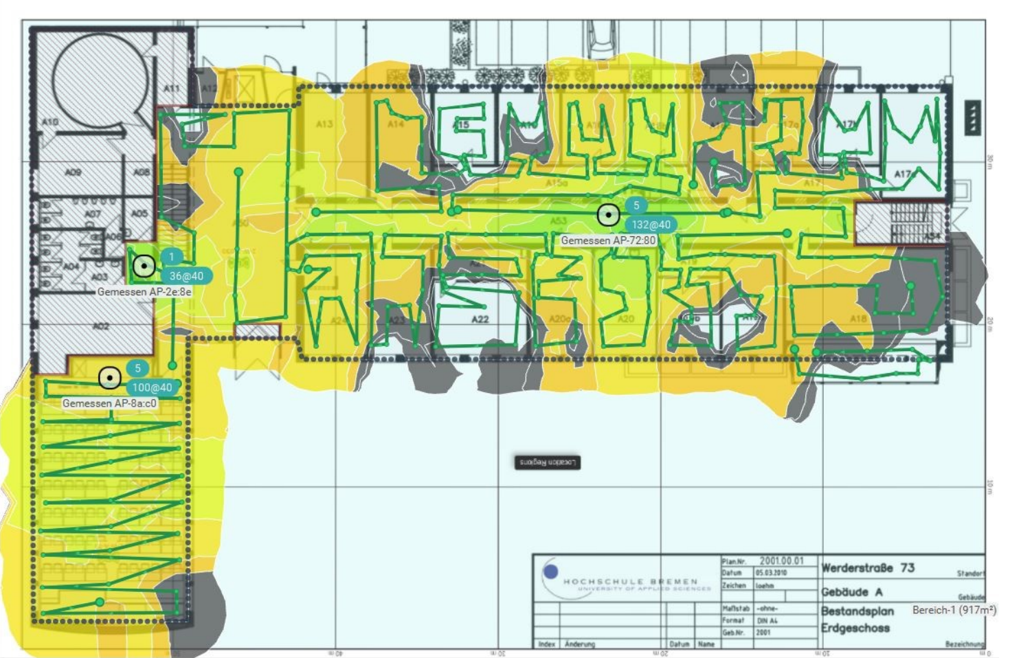 Hier werden die Messergebnisse zum Gebäude A an der Werderstraße gezeigt. Grün bedeutet gute WLAN Verfügbarkeit, gelb steht für ein schwächeres Signal. Diese Bilder dienen als Orientierung für den interessierten Nutzer. Sie wurden in Rahmen einer Messung im Dezember 2023 an der Werderstraße angefertigt.